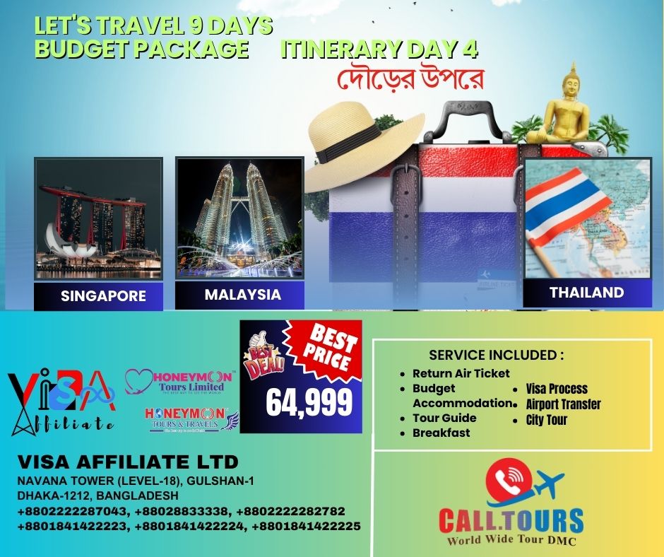 • Flights: Return airfare (Dhaka–Bangkok, Bangkok–Singapore, Kuala Lumpur–Dhaka) including taxes.